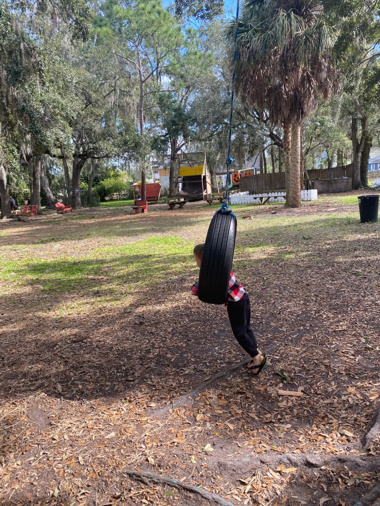 Then after walking the trail and seeing all the incredible animals, you come to a larger open field with a tire swing, some hanging swings, a zip line, picnic benches, and the horse field! The horses were very friendly and let the boys pet them.